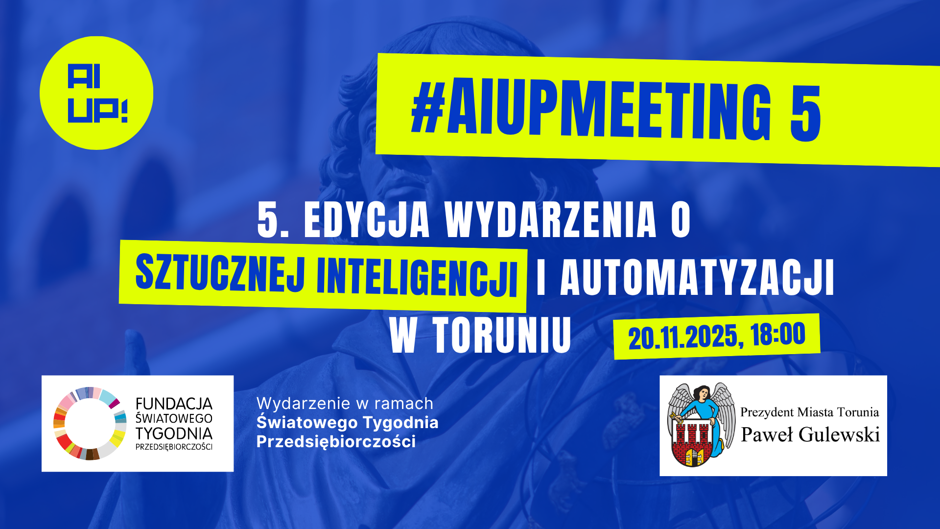 Tegoroczna 5. edycja #AIUPMEETING jest wydarzeniem towarzyszącym Światowemu Tygodniowi Przedsiębiorczości. Event otrzymał Honorowy Patronat Prezydent Miasta Torunia Pawła Gulewskiego. Wsparło nas również Centrum Wsparcia Biznesu w Toruniu oraz Fundacja Przedsiębiorczy Toruń. Do wyjątkowej atmosfery podczas spotkania przyczyniła się także Fabryka Cukiernicza Kopernik S.A., zapewniając uczestnikom słodkie „paliwo” sprzyjające rozmowom i networkingowi.